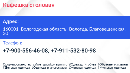 Кафешка, столовая по адресу 160001, Вологодская область, Вологда, Благовещенская, 30 в дальнейшем Организация, размещена в следующих категориях: