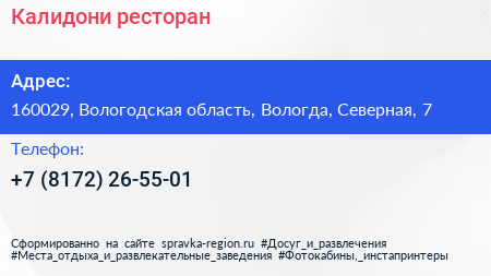 Калидони, ресторан по адресу 160029, Вологодская область, Вологда, Северная, 7 в дальнейшем Организация, размещена в следующих категориях: