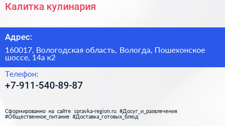 Калитка, кулинария по адресу 160017, Вологодская область, Вологда, Пошехонское шоссе, 14а к2 в дальнейшем Организация, размещена в следующих категориях:
