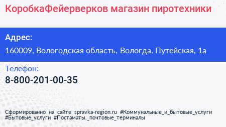 КоробкаФейерверков, магазин пиротехники по адресу 160009, Вологодская область, Вологда, Путейская, 1а в дальнейшем Организация, размещена в следующих категориях: