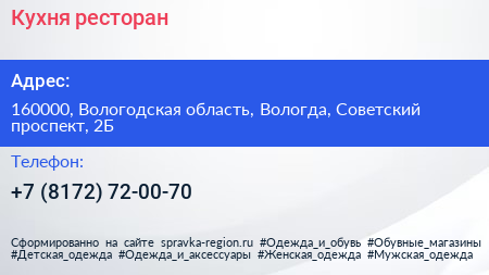 Кухня, ресторан по адресу 160000, Вологодская область, Вологда, Советский проспект, 2Б в дальнейшем Организация, размещена в следующих категориях: