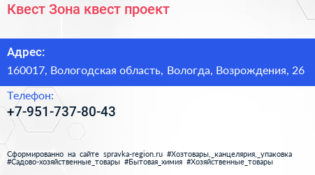 Квест-Зона, квест-проект по адресу 160017, Вологодская область, Вологда, Возрождения, 26 в дальнейшем Организация, размещена в следующих категориях: