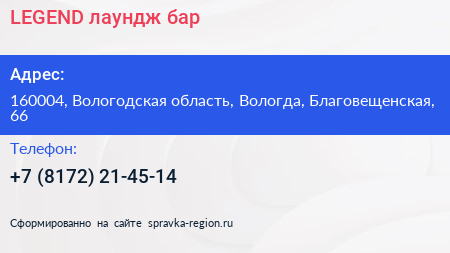 LEGEND, лаундж-бар по адресу 160004, Вологодская область, Вологда, Благовещенская, 66 в дальнейшем Организация, размещена в следующих категориях: