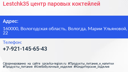 Lestchk35, центр паровых коктейлей по адресу 160000, Вологодская область, Вологда, Марии Ульяновой, 22 в дальнейшем Организация, размещена в следующих категориях: