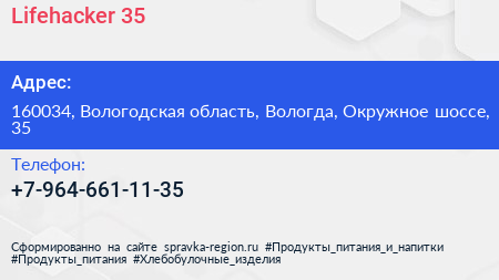 Lifehacker 35 по адресу 160034, Вологодская область, Вологда, Окружное шоссе, 35 в дальнейшем Организация, размещена в следующих категориях: