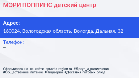 МЭРИ ПОППИНС, детский центр по адресу 160024, Вологодская область, Вологда, Дальняя, 32 в дальнейшем Организация, размещена в следующих категориях:
