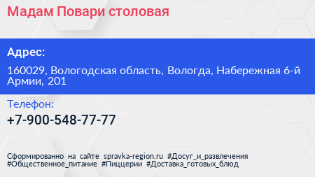 Мадам Повари, столовая по адресу 160029, Вологодская область, Вологда, Набережная 6-й Армии, 201 в дальнейшем Организация, размещена в следующих категориях: