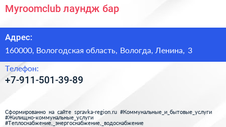 Myroomclub, лаундж-бар по адресу 160000, Вологодская область, Вологда, Ленина, 3 в дальнейшем Организация, размещена в следующих категориях: