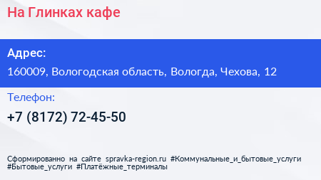 На Глинках, кафе по адресу 160009, Вологодская область, Вологда, Чехова, 12 в дальнейшем Организация, размещена в следующих категориях: