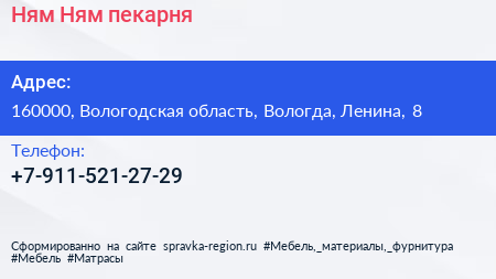 Ням-Ням, пекарня по адресу 160000, Вологодская область, Вологда, Ленина, 8 в дальнейшем Организация, размещена в следующих категориях: