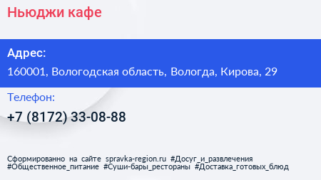 Ньюджи, кафе по адресу 160001, Вологодская область, Вологда, Кирова, 29 в дальнейшем Организация, размещена в следующих категориях: