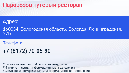 Паровозов, путевый ресторан по адресу 160034, Вологодская область, Вологда, Ленинградская, 97Б в дальнейшем Организация, размещена в следующих категориях: