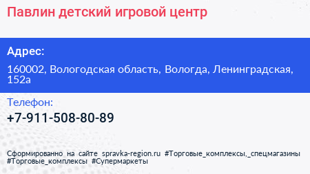 Павлин, детский игровой центр по адресу 160002, Вологодская область, Вологда, Ленинградская, 152а в дальнейшем Организация, размещена в следующих категориях: