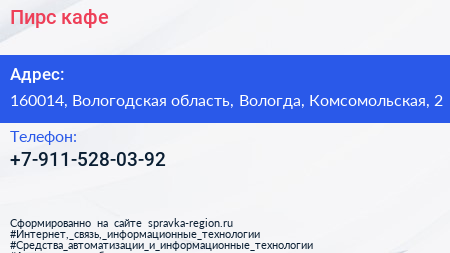 Пирс, кафе по адресу 160014, Вологодская область, Вологда, Комсомольская, 2 в дальнейшем Организация, размещена в следующих категориях:
