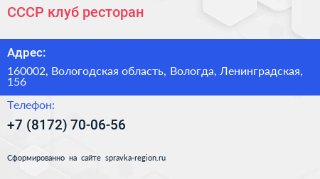 СССР, клуб-ресторан по адресу 160002, Вологодская область, Вологда, Ленинградская, 156 в дальнейшем Организация, размещена в следующих категориях: