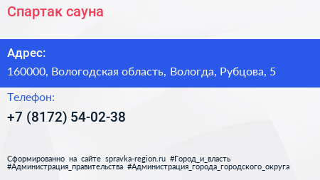 Спартак, сауна по адресу 160000, Вологодская область, Вологда, Рубцова, 5 в дальнейшем Организация, размещена в следующих категориях: