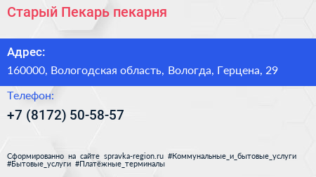 Старый Пекарь, пекарня по адресу 160000, Вологодская область, Вологда, Герцена, 29 в дальнейшем Организация, размещена в следующих категориях: