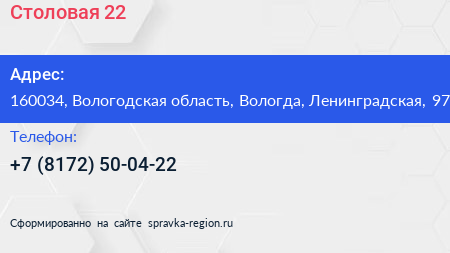Столовая №22 по адресу 160034, Вологодская область, Вологда, Ленинградская, 97 в дальнейшем Организация, размещена в следующих категориях: