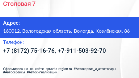 Столовая №7 по адресу 160012, Вологодская область, Вологда, Козлёнская, 86 в дальнейшем Организация, размещена в следующих категориях: