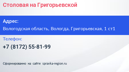 Столовая на Григорьевской по адресу Вологодская область, Вологда, Григорьевская, 1 ст1 в дальнейшем Организация, размещена в следующих категориях: