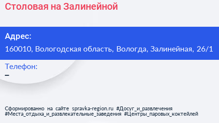 Столовая на Залинейной по адресу 160010, Вологодская область, Вологда, Залинейная, 26/1 в дальнейшем Организация, размещена в следующих категориях: