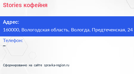 Stories, кофейня по адресу 160000, Вологодская область, Вологда, Предтеченская, 24 в дальнейшем Организация, размещена в следующих категориях:
