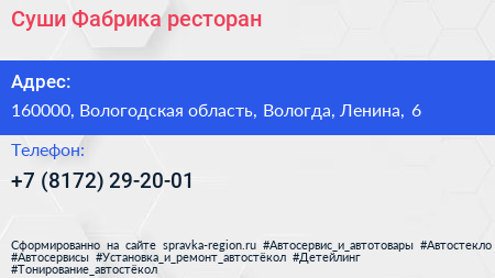 Суши Фабрика, ресторан по адресу 160000, Вологодская область, Вологда, Ленина, 6 в дальнейшем Организация, размещена в следующих категориях: