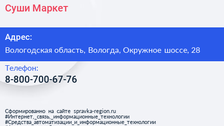 Суши-Маркет по адресу Вологодская область, Вологда, Окружное шоссе, 28 в дальнейшем Организация, размещена в следующих категориях: