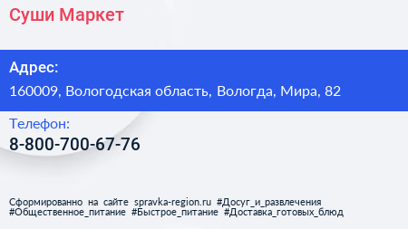 Суши-Маркет по адресу 160009, Вологодская область, Вологда, Мира, 82 в дальнейшем Организация, размещена в следующих категориях: