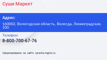 Суши-Маркет по адресу 160002, Вологодская область, Вологда, Ленинградская, 100 в дальнейшем Организация, размещена в следующих категориях: