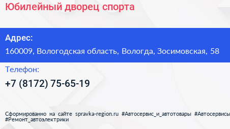 Юбилейный, дворец спорта по адресу 160009, Вологодская область, Вологда, Зосимовская, 58 в дальнейшем Организация, размещена в следующих категориях: