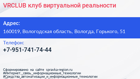 VRCLUB, клуб виртуальной реальности по адресу 160019, Вологодская область, Вологда, Горького, 51 в дальнейшем Организация, размещена в следующих категориях: