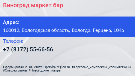 Виноград, маркет-бар по адресу 160012, Вологодская область, Вологда, Герцена, 104а в дальнейшем Организация, размещена в следующих категориях: