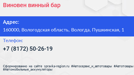 Виновен, винный бар по адресу 160000, Вологодская область, Вологда, Пушкинская, 1 в дальнейшем Организация, размещена в следующих категориях:
