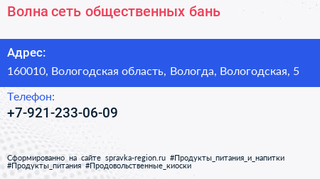 Волна, сеть общественных бань по адресу 160010, Вологодская область, Вологда, Вологодская, 5 в дальнейшем Организация, размещена в следующих категориях: