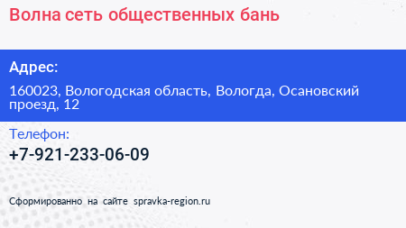 Волна, сеть общественных бань по адресу 160023, Вологодская область, Вологда, Осановский проезд, 12 в дальнейшем Организация, размещена в следующих категориях: