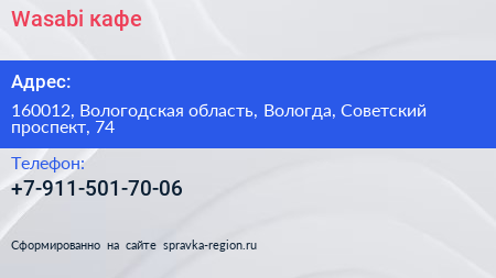 Wasabi, кафе по адресу 160012, Вологодская область, Вологда, Советский проспект, 74 в дальнейшем Организация, размещена в следующих категориях: