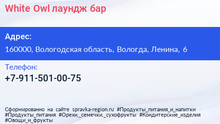 White Owl, лаундж-бар по адресу 160000, Вологодская область, Вологда, Ленина, 6 в дальнейшем Организация, размещена в следующих категориях: