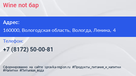 Wine not?, бар по адресу 160000, Вологодская область, Вологда, Ленина, 4 в дальнейшем Организация, размещена в следующих категориях:
