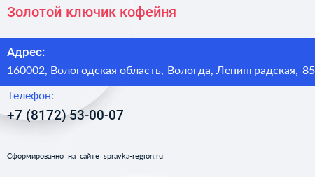 Золотой ключик, кофейня по адресу 160002, Вологодская область, Вологда, Ленинградская, 85 в дальнейшем Организация, размещена в следующих категориях: