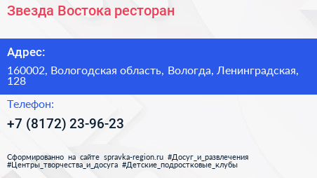 Звезда Востока, ресторан по адресу 160002, Вологодская область, Вологда, Ленинградская, 128 в дальнейшем Организация, размещена в следующих категориях: