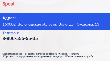 5post по адресу 160002, Вологодская область, Вологда, Южакова, 13 в дальнейшем Организация, размещена в следующих категориях: