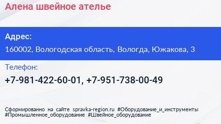 Алена, швейное ателье по адресу 160002, Вологодская область, Вологда, Южакова, 3 в дальнейшем Организация, размещена в следующих категориях: