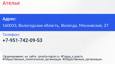 Ателье по адресу 160033, Вологодская область, Вологда, Московская, 27 в дальнейшем Организация, размещена в следующих категориях: