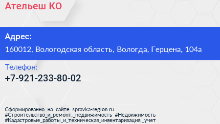 Ательеш`КО по адресу 160012, Вологодская область, Вологда, Герцена, 104а в дальнейшем Организация, размещена в следующих категориях: