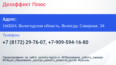 Дезэффект Плюс по адресу 160024, Вологодская область, Вологда, Северная, 34 в дальнейшем Организация, размещена в следующих категориях: