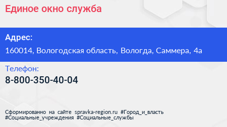 Единое окно, служба по адресу 160014, Вологодская область, Вологда, Саммера, 4а в дальнейшем Организация, размещена в следующих категориях: