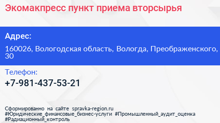 Экомакпресс, пункт приема вторсырья по адресу 160026, Вологодская область, Вологда, Преображенского, 30 в дальнейшем Организация, размещена в следующих категориях: