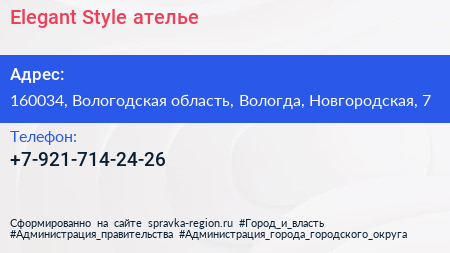 Elegant Style, ателье по адресу 160034, Вологодская область, Вологда, Новгородская, 7 в дальнейшем Организация, размещена в следующих категориях: