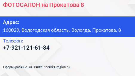 ФОТОСАЛОН на Прокатова, 8 по адресу 160029, Вологодская область, Вологда, Прокатова, 8 в дальнейшем Организация, размещена в следующих категориях: